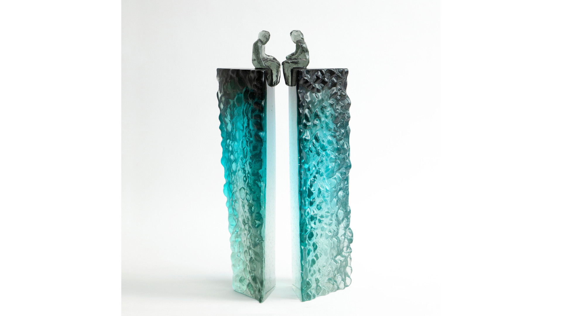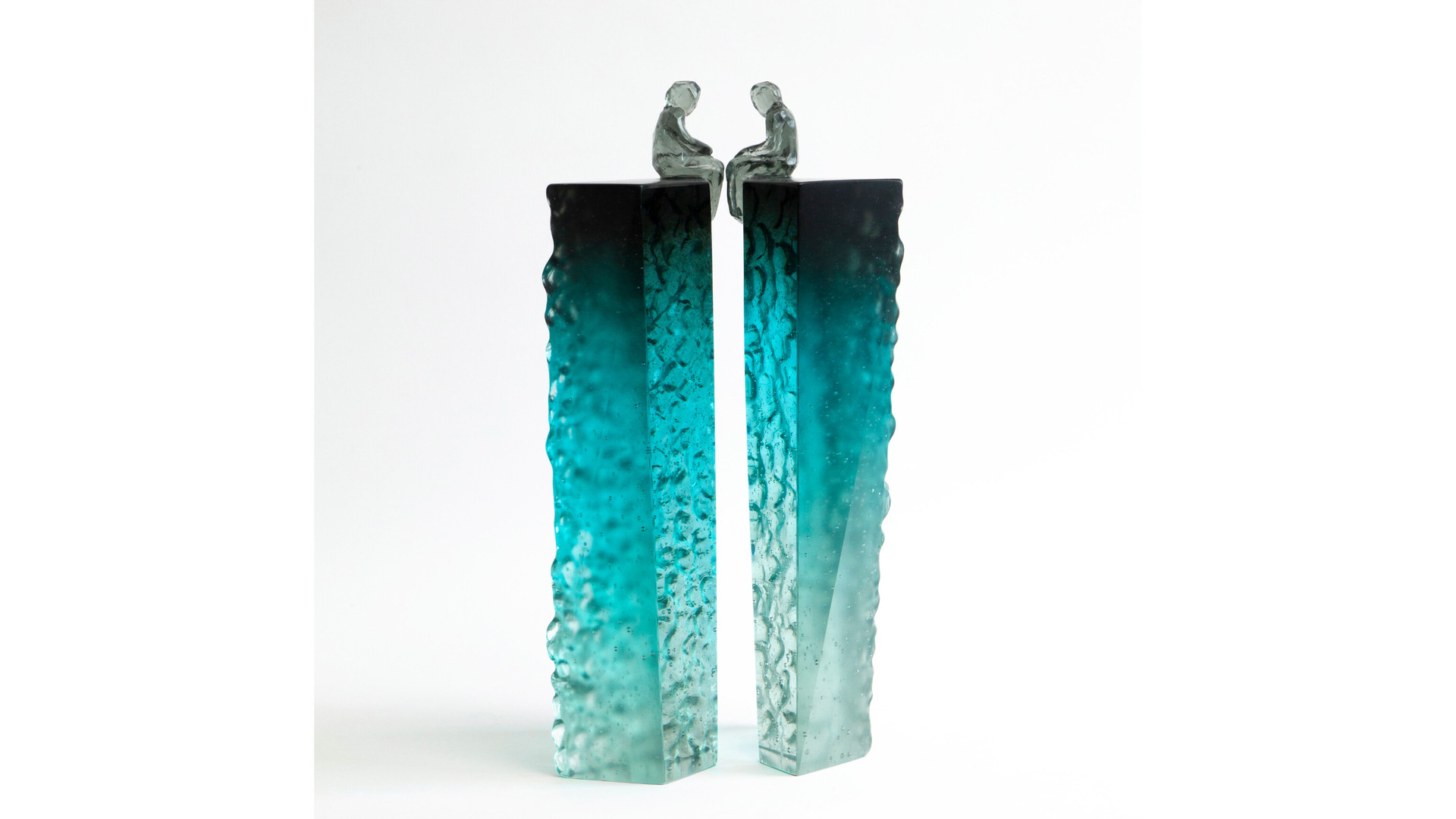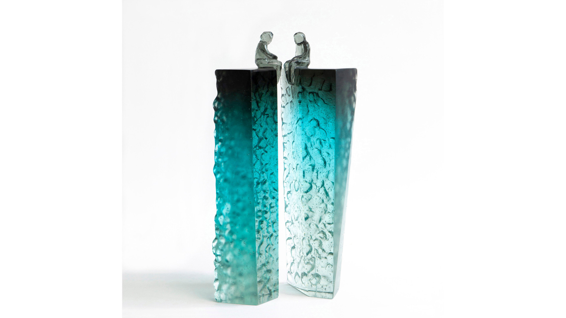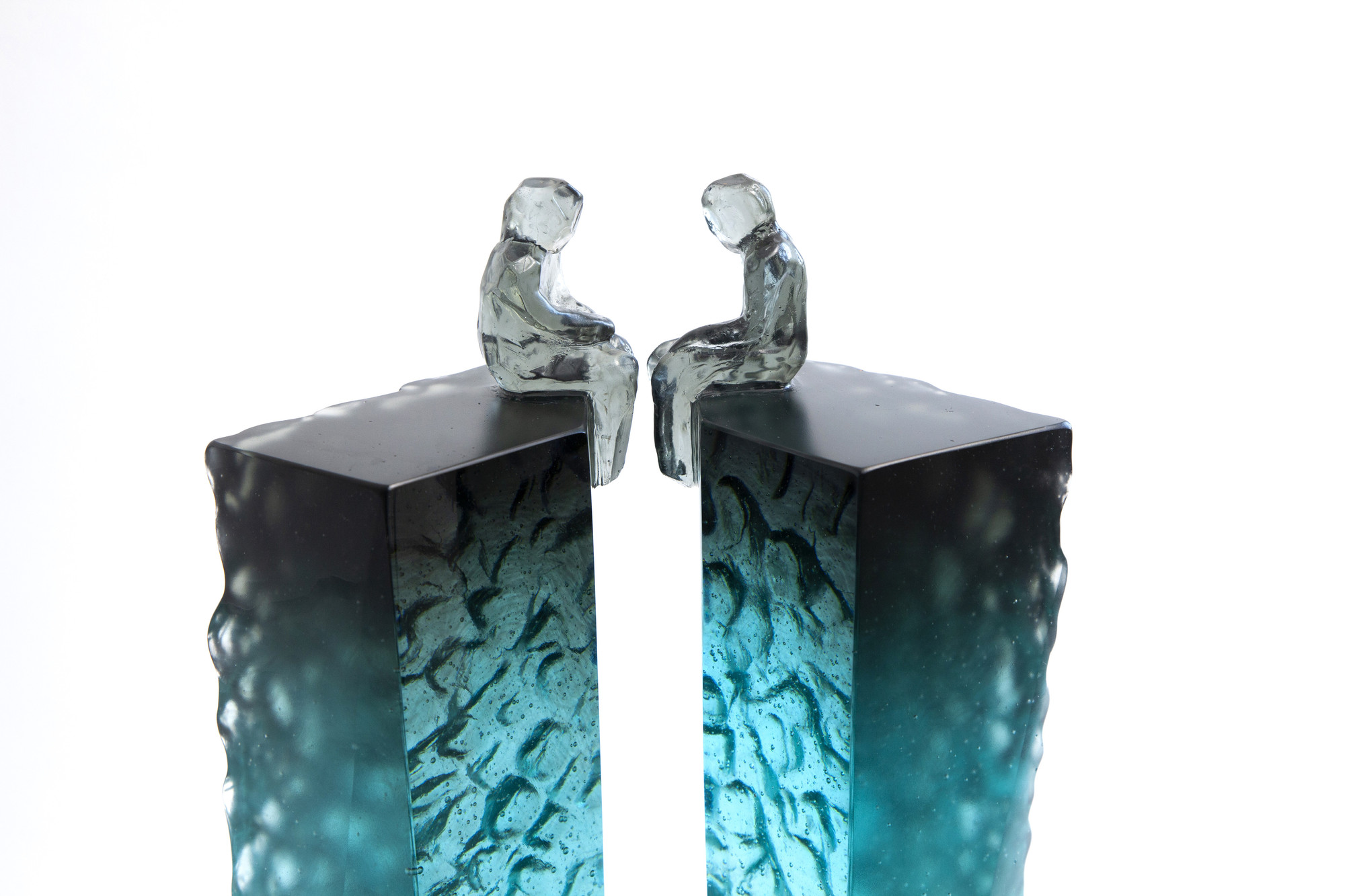 Elevated Conversation 4 is a striking pair of cast glass artworks featuring faceted, universal figures perched on tall, plinth-like forms. The blue grey colouring at the top gradually fades to an icy clear base, creating a beautiful sense of elevation and lightness. Deeply carved, natural textures contrast with opposing polished surfaces, some finished with a subtle stain for added depth. These artworks can be arranged in multiple ways, inviting reflections on connection, communication, and the many forms relationships can take.