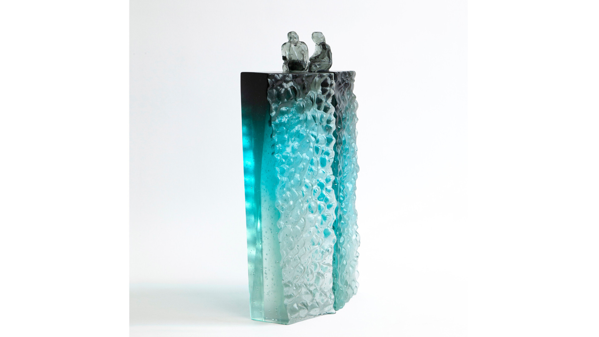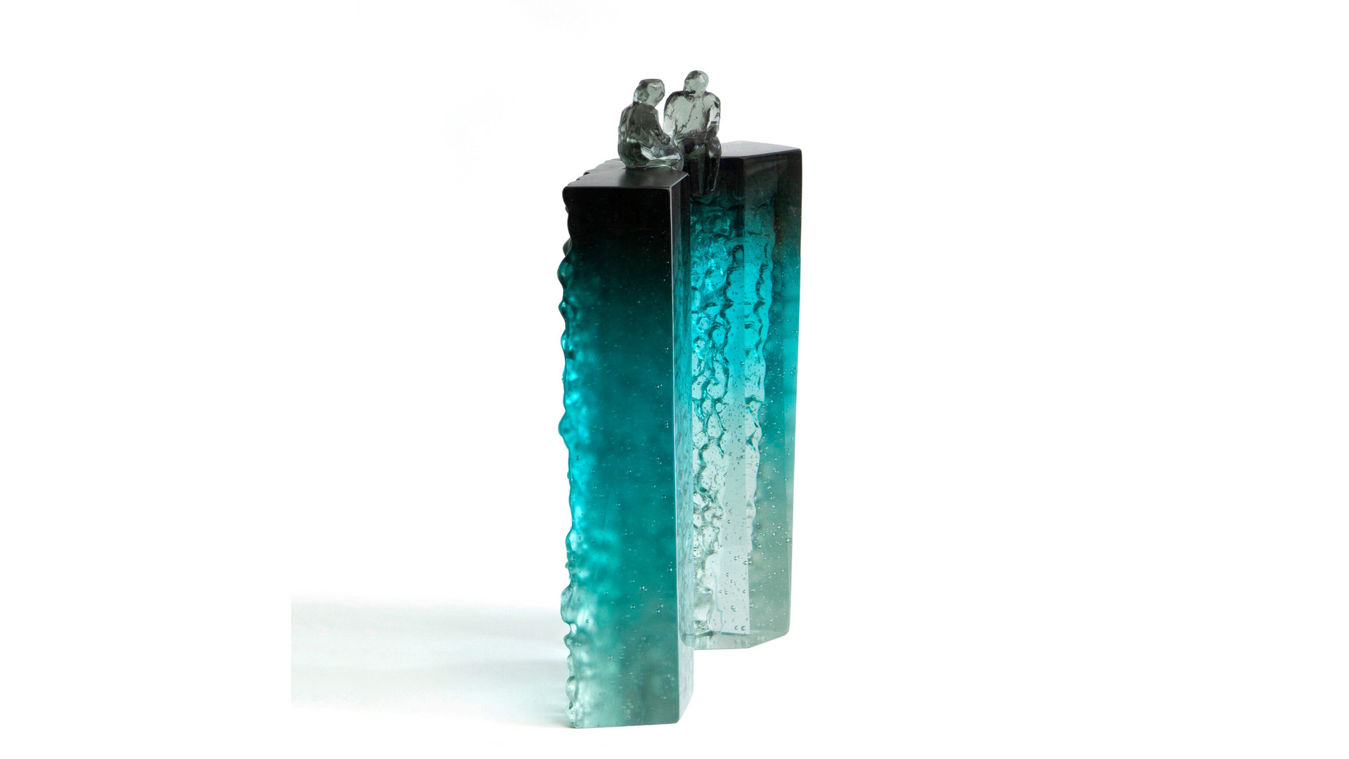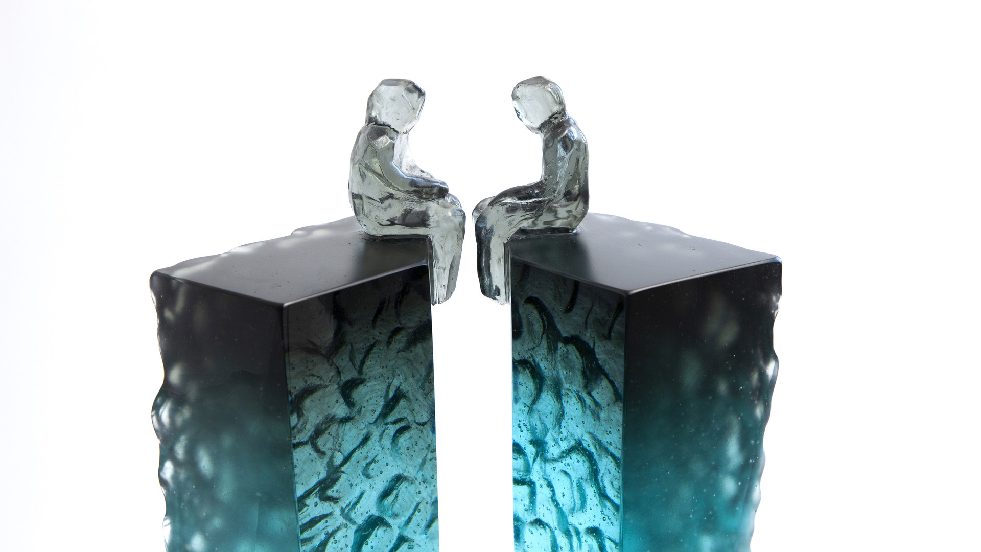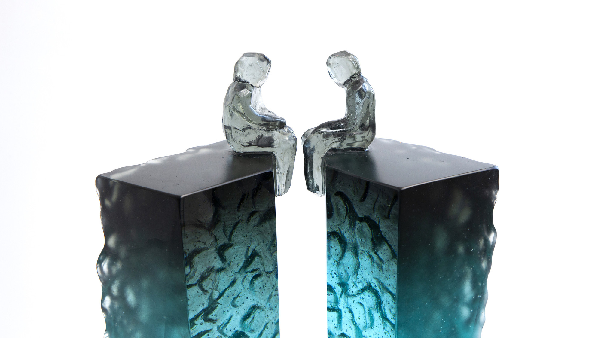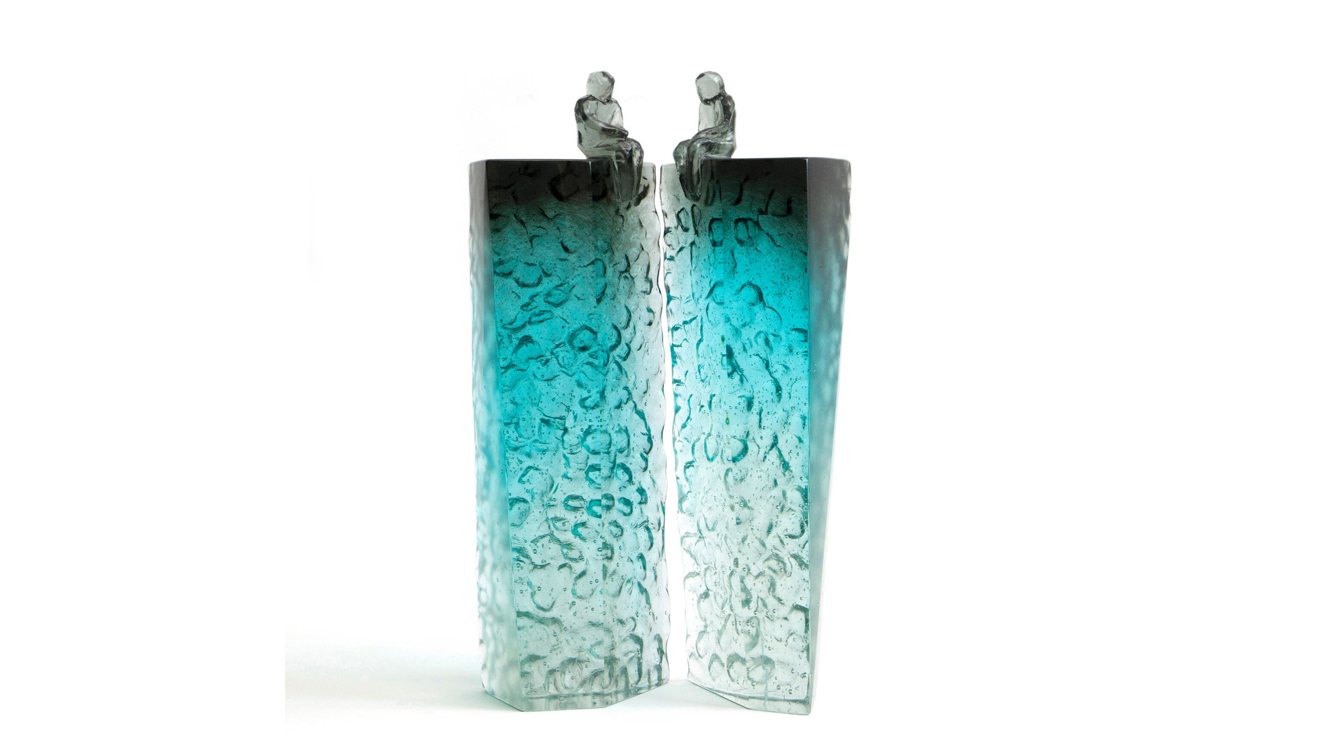 Elevated Conversation 4 is a striking pair of cast glass artworks featuring faceted, universal figures perched on tall, plinth-like forms. The blue grey colouring at the top gradually fades to an icy clear base, creating a beautiful sense of elevation and lightness. Deeply carved, natural textures contrast with opposing polished surfaces, some finished with a subtle stain for added depth. These artworks can be arranged in multiple ways, inviting reflections on connection, communication, and the many forms relationships can take.